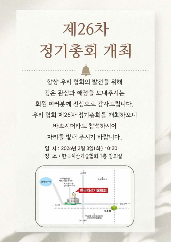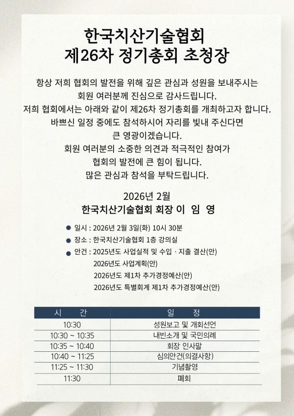 제26차 정기총회 개최 알림 페이지 정보 작성자 한국치산기술협회 댓글 0건 조회 51회 작성일 26-01-26 09:50 목록 본문 다음글공공기관 고객만족도 조사 관련 개인정보처리의 위탁사항 알림 26.01.09 목록