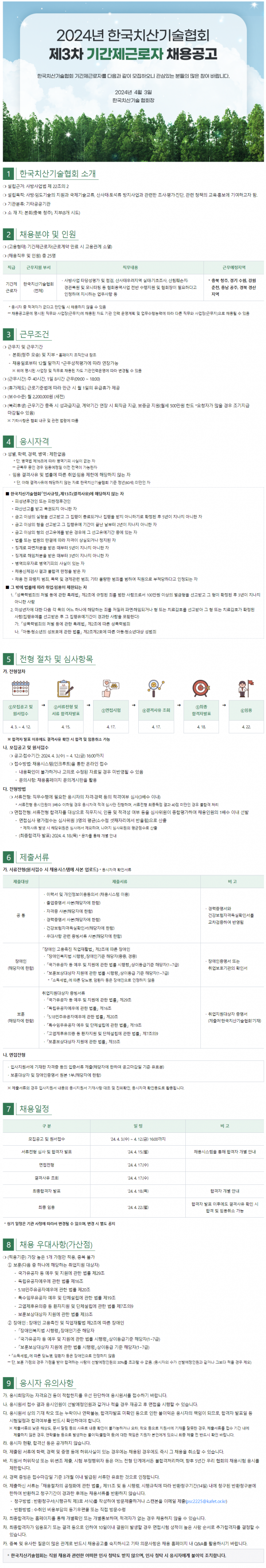 2024년도 한국치산기술협회 기간제 근로자(3차) 채용 공고 페이지 정보 작성자 한국치산기술협회 댓글 0건 조회 6,740회 작성일 24-04-03 16:22 목록 본문 신청주소 https://recruit.incruit.com/kafet/job/2404030010 이전글2024년도 한국치산기술협회 전문경력직(나급) 채용 공고 24.04.08 다음글2024년도 기간제 근로자 채용(2차) 최종합격자 공고 24.03.28 목록